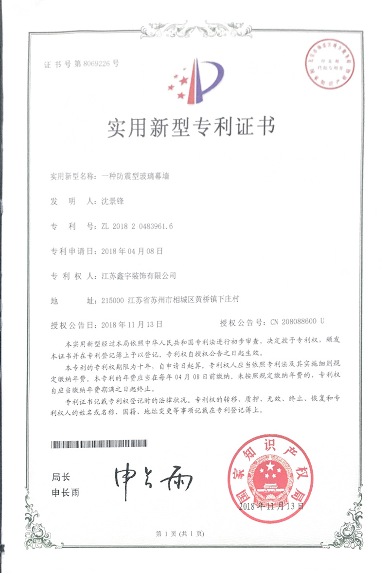 當前位置:首頁 / 關于鑫宇 / 企業(yè)資質(zhì)一種防震型玻璃幕墻實用新型專利證書
